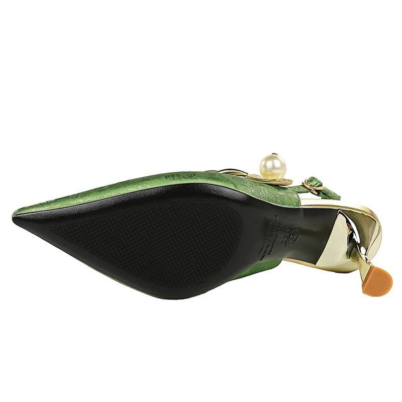 2024 New Ethnic Style Women Pumps Silks Satins High Heels Pointed Hollow Women Sandals Metal Heel Kitten Heels Sexy Party Shoes