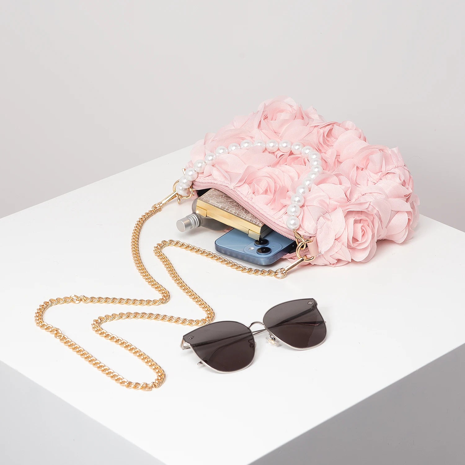 Elegant rose Flower dinner bag, Faux pearl handbag, metal chain crossbody bag, bridal bag (random pattern)