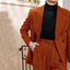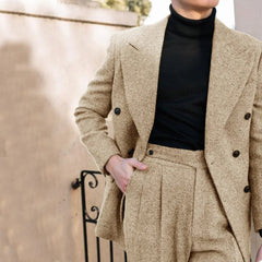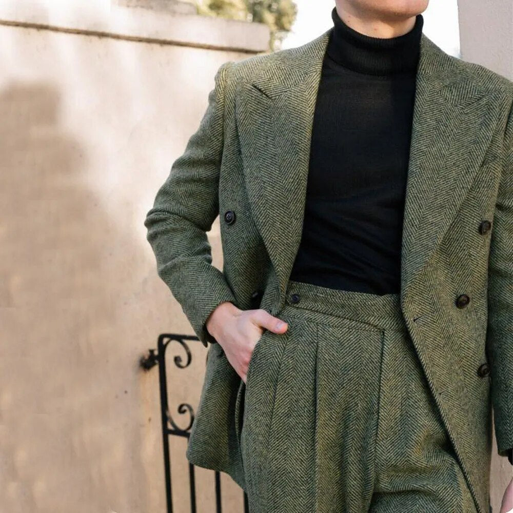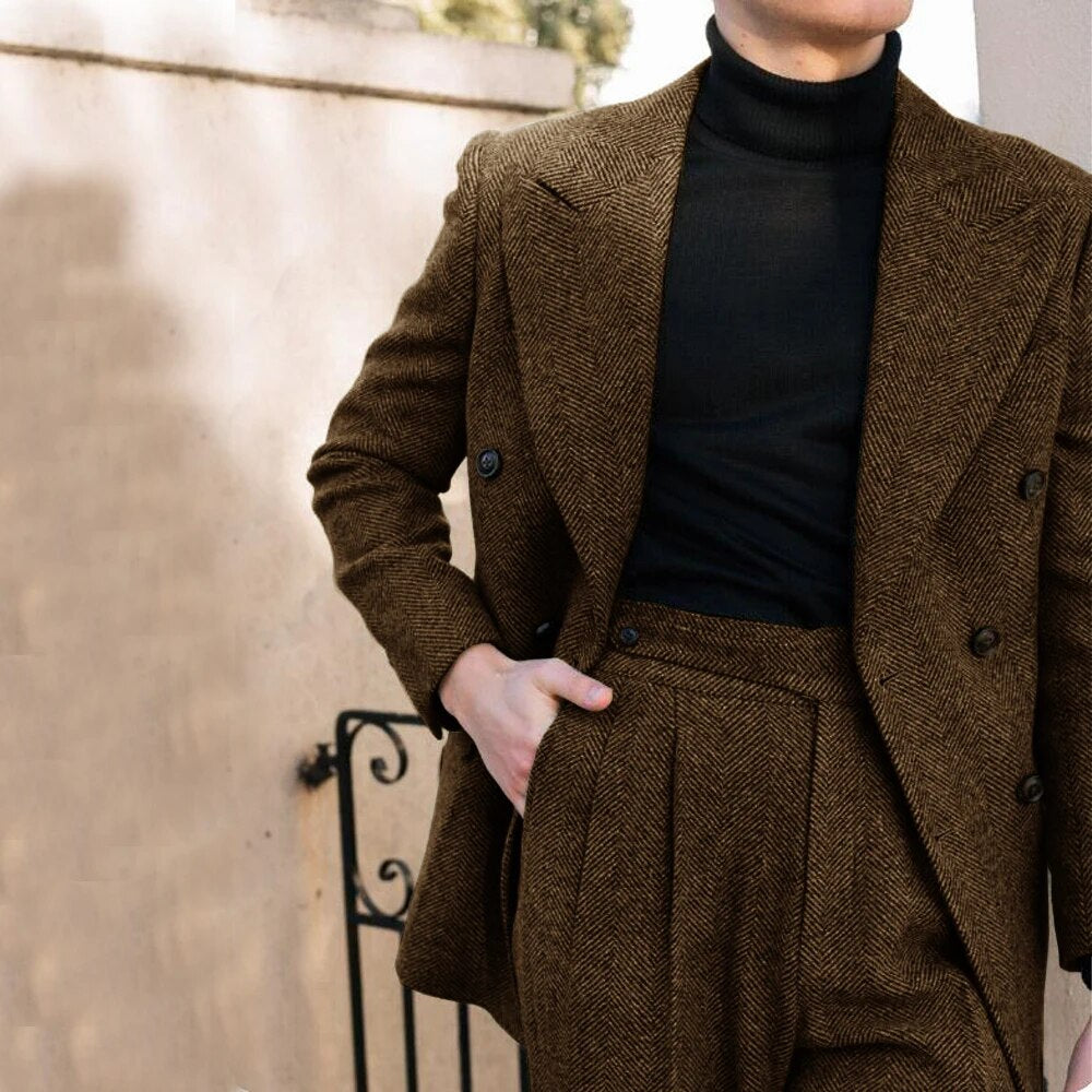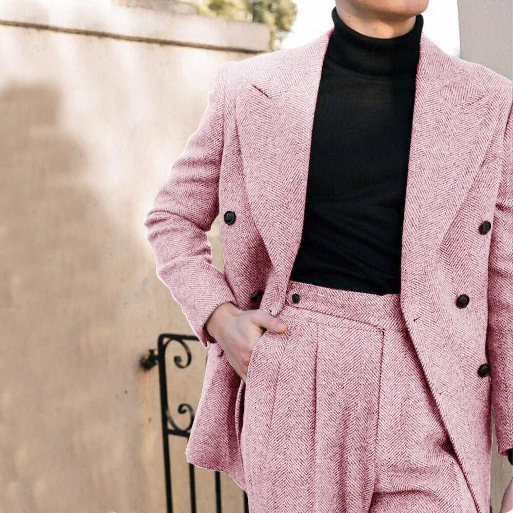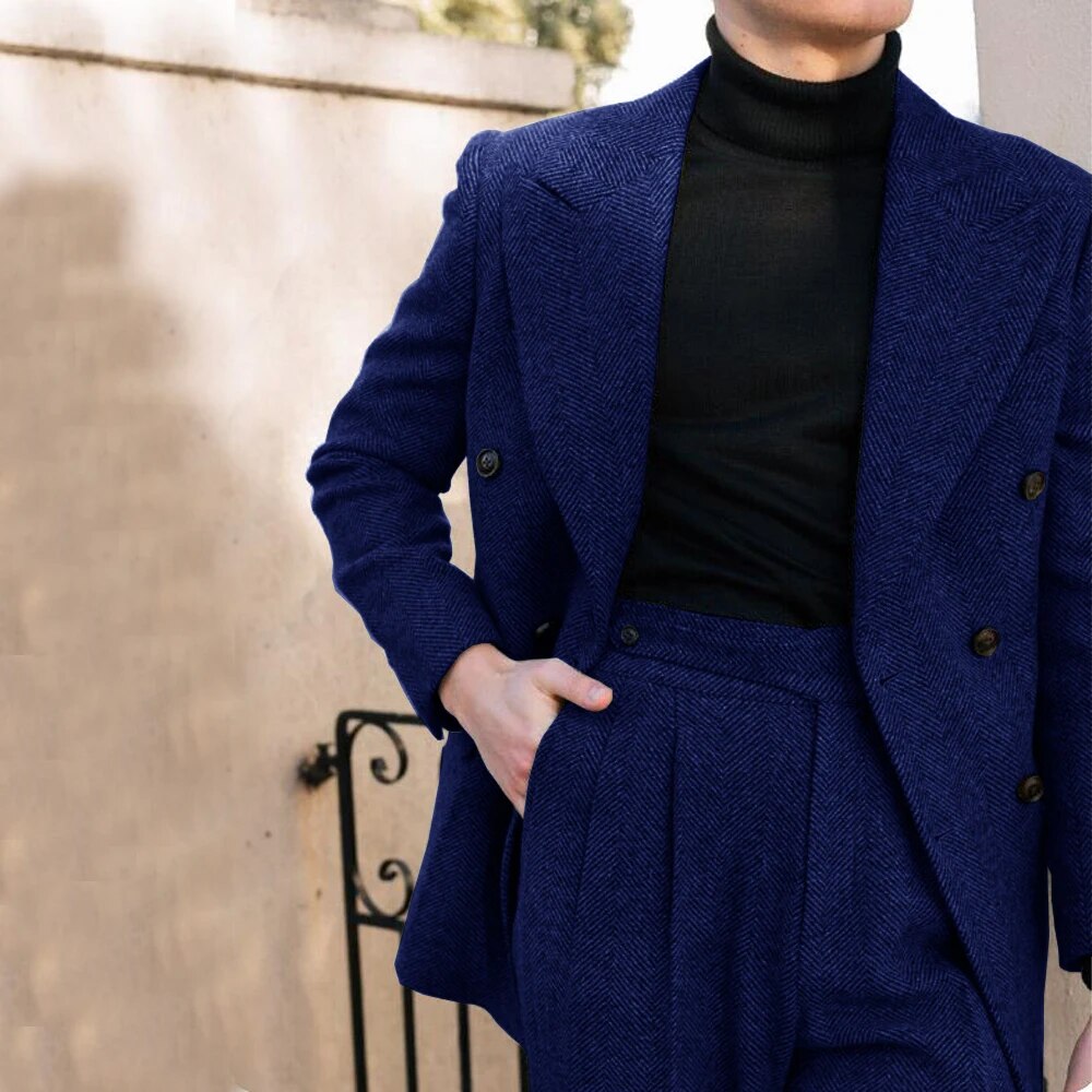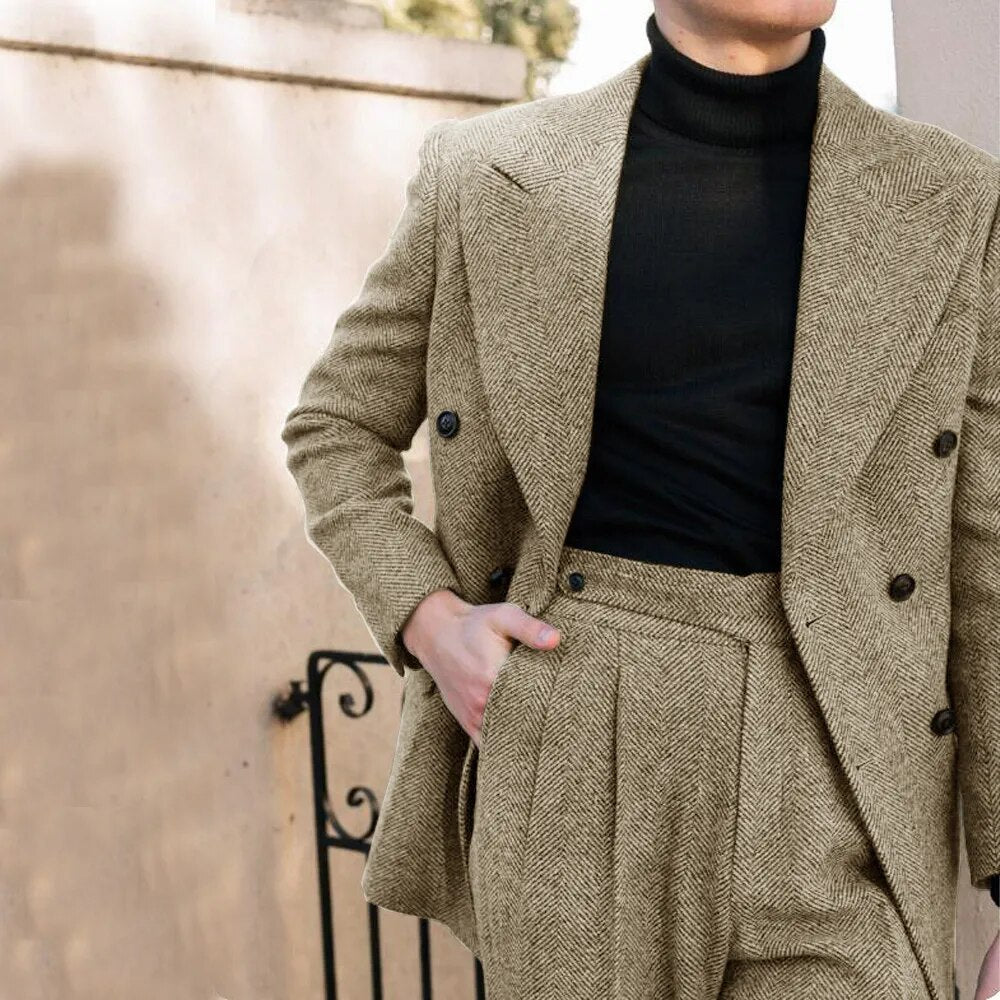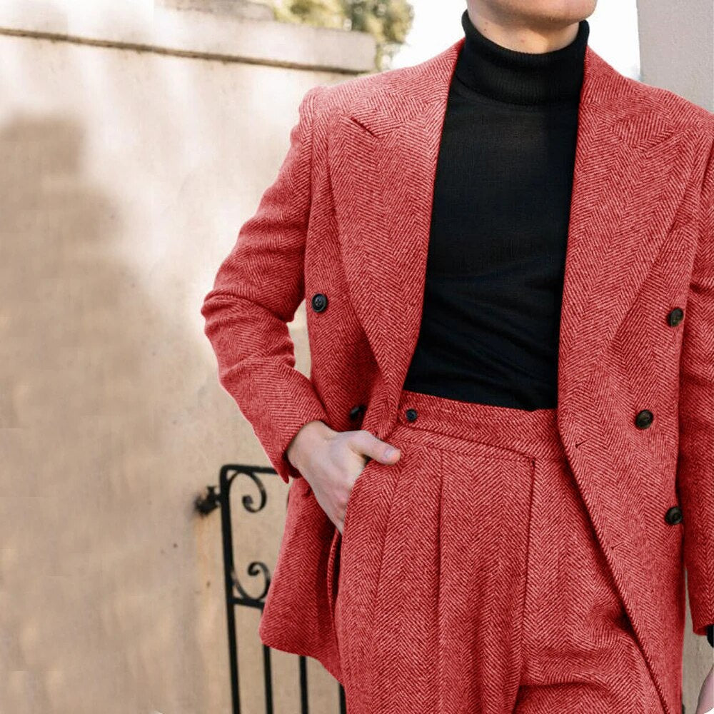Suit Herringbone Double Breasted Formal Lapel 2 Piece Men's Elegant Slim Fit (Polyester)