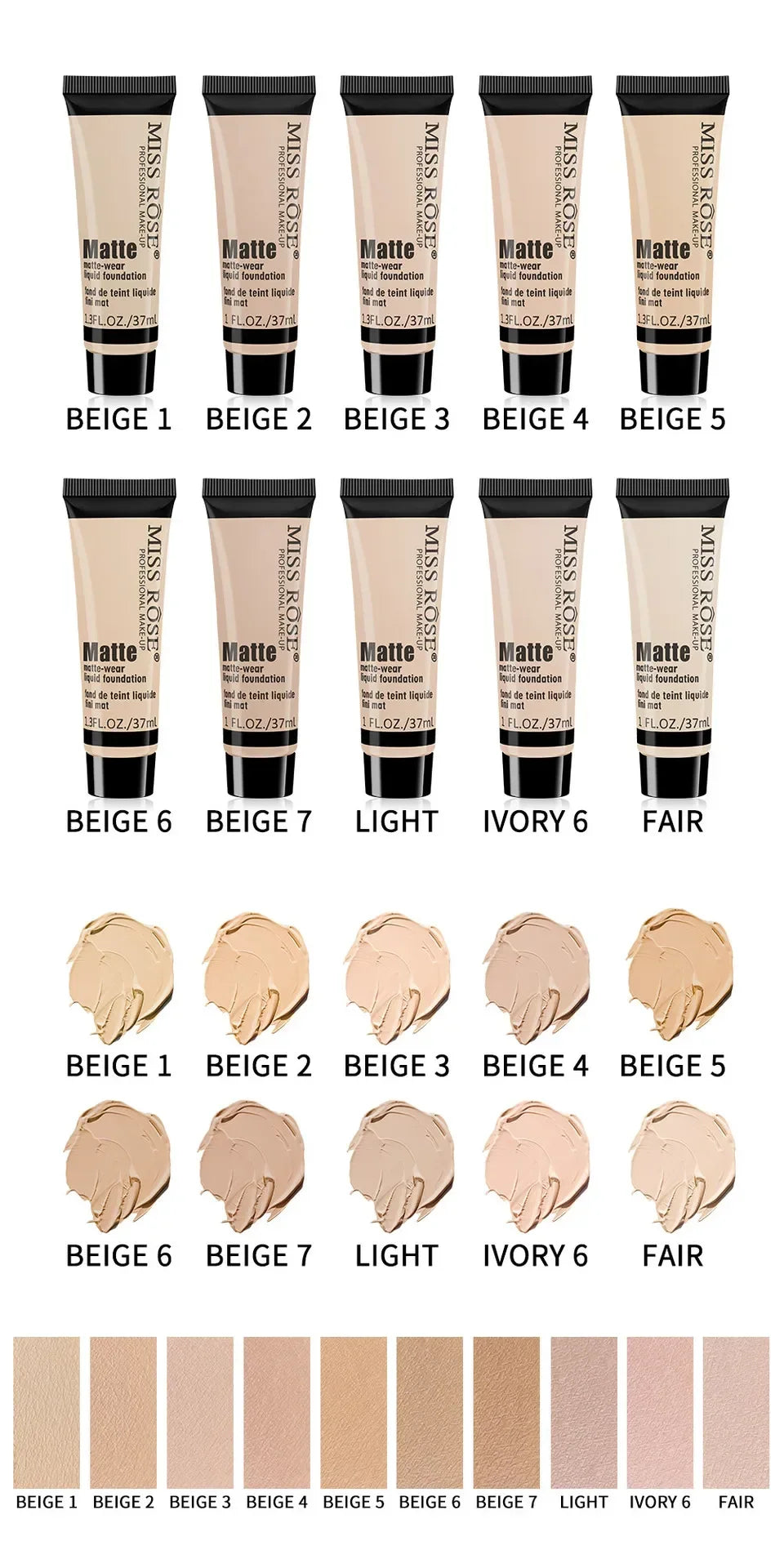 Miss Rose Long-Lasting Natural Nude Matte Foundation Makeup Face Mineral Pigment Liquid Foundation Concealer Full Coverage