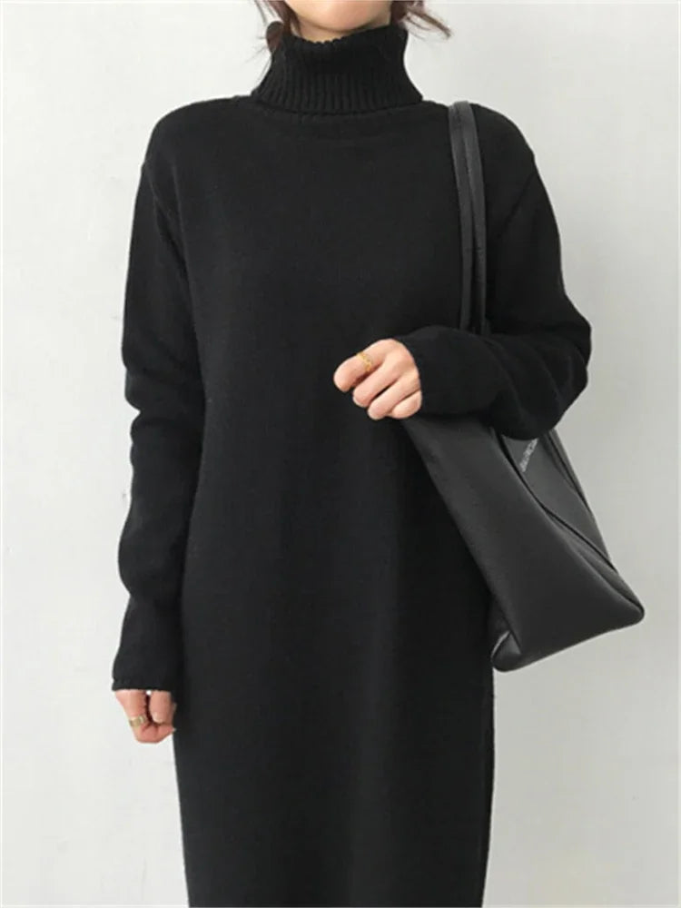 Wool Winter Womens Dress Fall Sweater Women Dress Long Sleeve Knitted Dresses Maxi Vintage Oversize Dresses Knitting Turtleneck